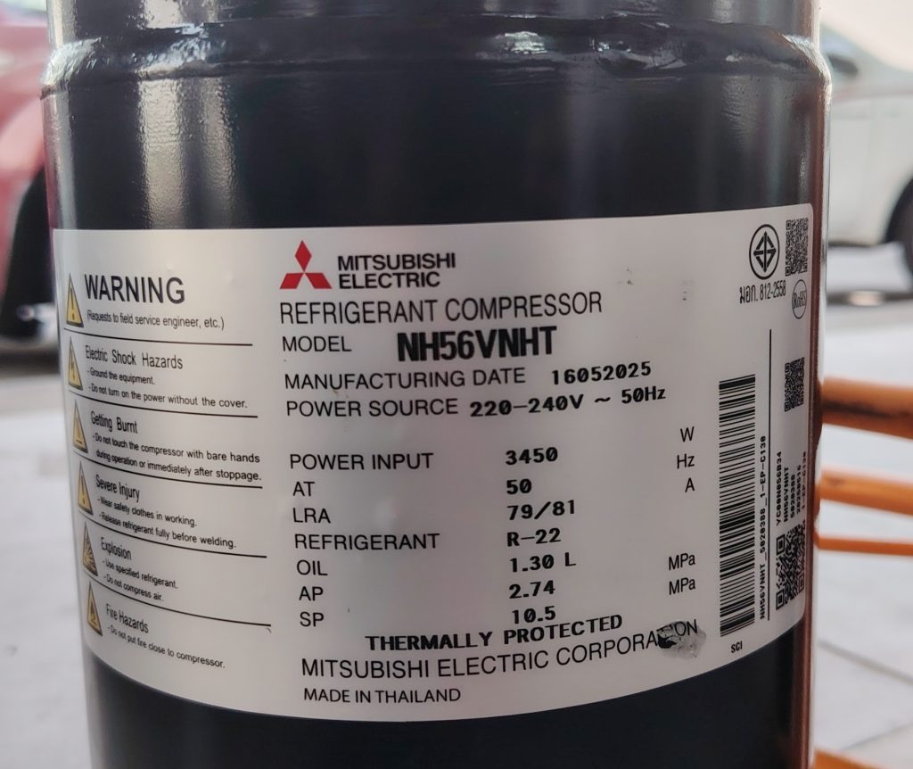 Mitsubishi 3Ton Compressor NH56VNHT R22 / 1PH /50HZ Specifications