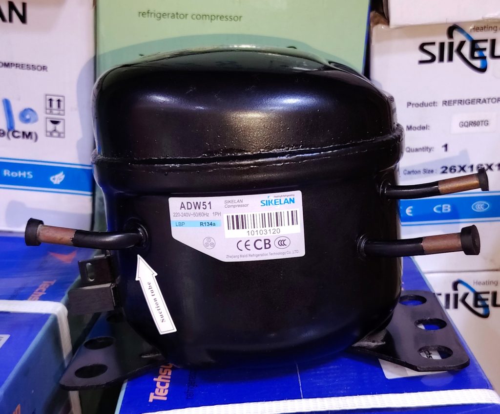 The Refrigerant Compressor ADW51 is a widely used hermetic refrigeration compressor designed for small to medium cooling applications. Due to its stable performance, compact size, and energy efficiency, this compressor is commonly found in domestic refrigerators, freezers, and commercial cooling equipment. Refrigerant Compressor ADW51 Sikelan 1/6HP | 220-240V-R134a.